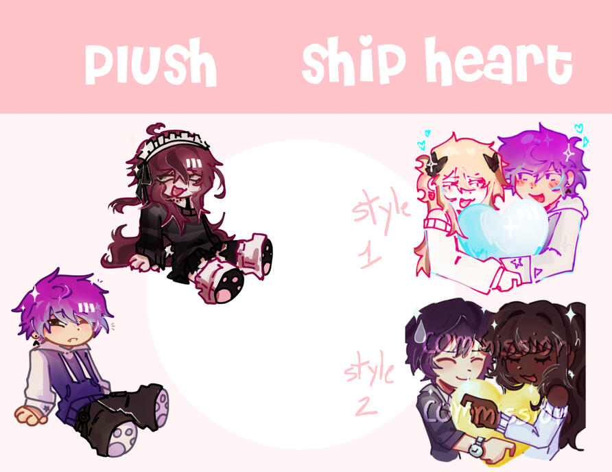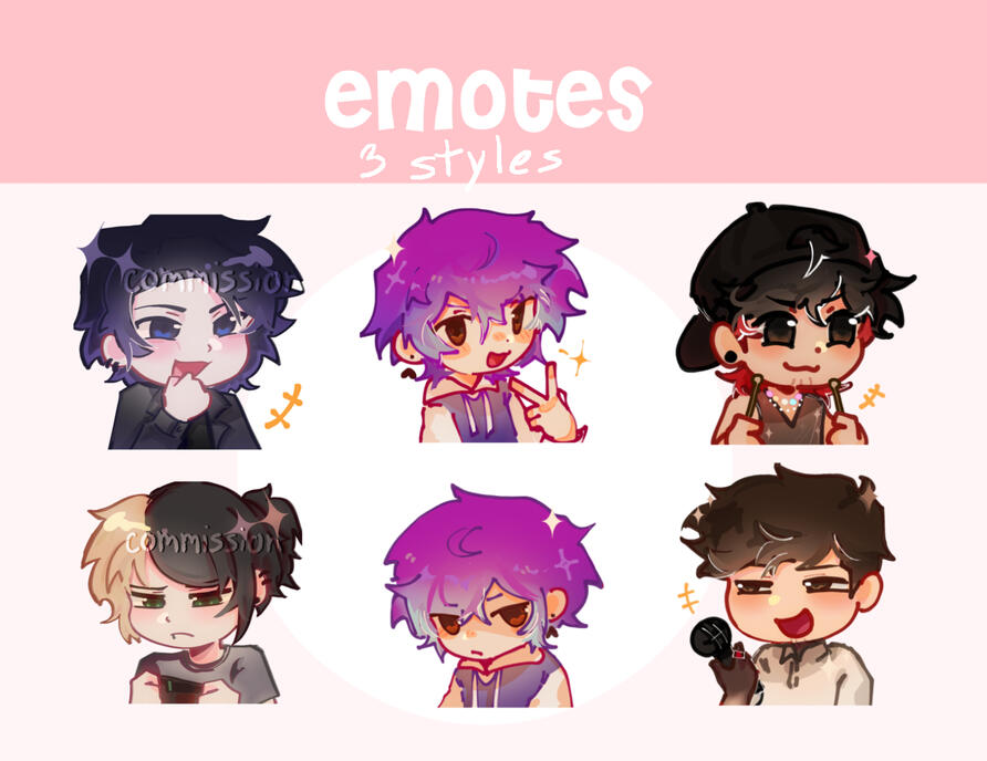 | 1-4 emotes | 5-8 emotes | Ship heart | Character plush | Anything else can be discussed in DMs (aka chibi art or stickers) |